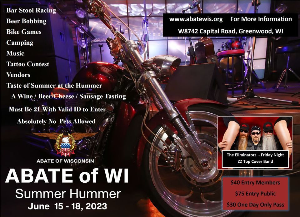 Join us for the ABATE of Wisconsin Summer Hummer! Bar stool racing is back! We are also having the Taste of Summer at the Hummer again on Saturday. Great live music. Visit https://abatewis.org/hummer2023/ for additional information, sponsor, and vendor registration forms.