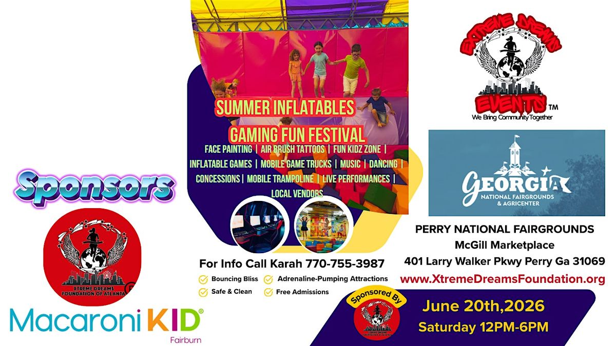 #SummerFun #Inflatables #GamingFestival #FamilyFun #XtremeDreamsFoundation #PerryGAEvents #VendorOpportunity #KidsZone #FacePainting #MobileGameTrucks #LiveMusic #CommunityEvent #FreeAdmission #XtremeVibeEvents #SupportLocalVendors #InflatableGames #SummerFestival2026