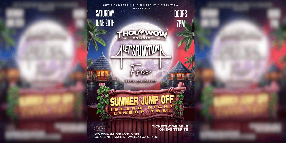 Kicking off the 4th year of their annual Summer Show series, Let's Function Entertianment joins FMC Vallejo in collaboration with Thou Wow Studio to bring you Summer Jump Off: Island Night! We're featuring an entire lineup of Polynesian artists that's guaranteed to be a vibe from start to finish. First artist announcement will be Monday, April 27th. It all takes place Saturday June 20th at Carnalitos in Vallejo. Doors open at 7, show starts at 8. Drinks & food will be available for purchase all night along with merchandise from select vendors. Security will be enforced upon entering and throughout the entire event as well as the 18+ age restriction. IDs and ticket confirmations will be checked at entry. No refunds will be given under any circumstances unless postponement or cancellation of event occurs.