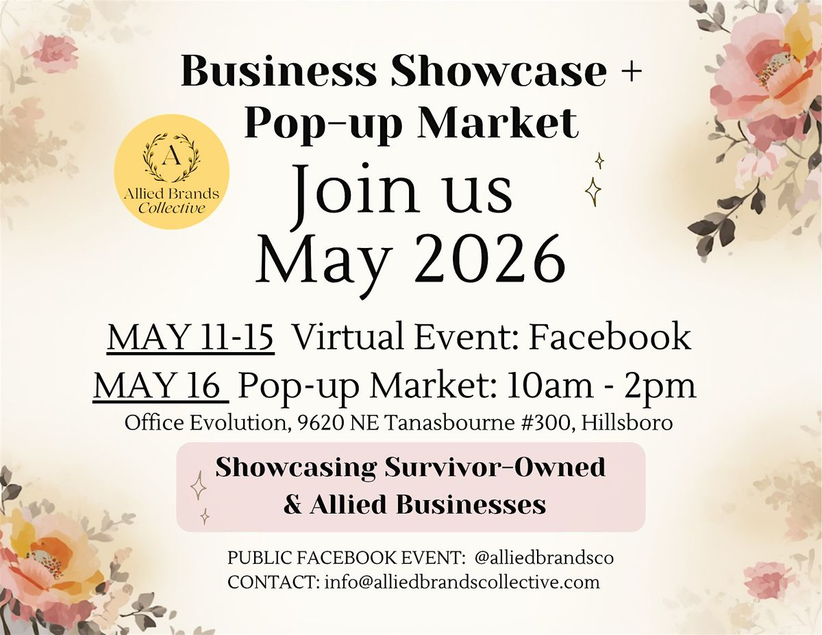 Allied Brands Collective is hosting our Summer Market, a free, in-person pop-up at Office Evolution in Hillsboro, featuring Survivor-owned and Survivor-allied small businesses. This May Pop-up is open to the public and we invite you to join us for a day of shopping, connection, and community.