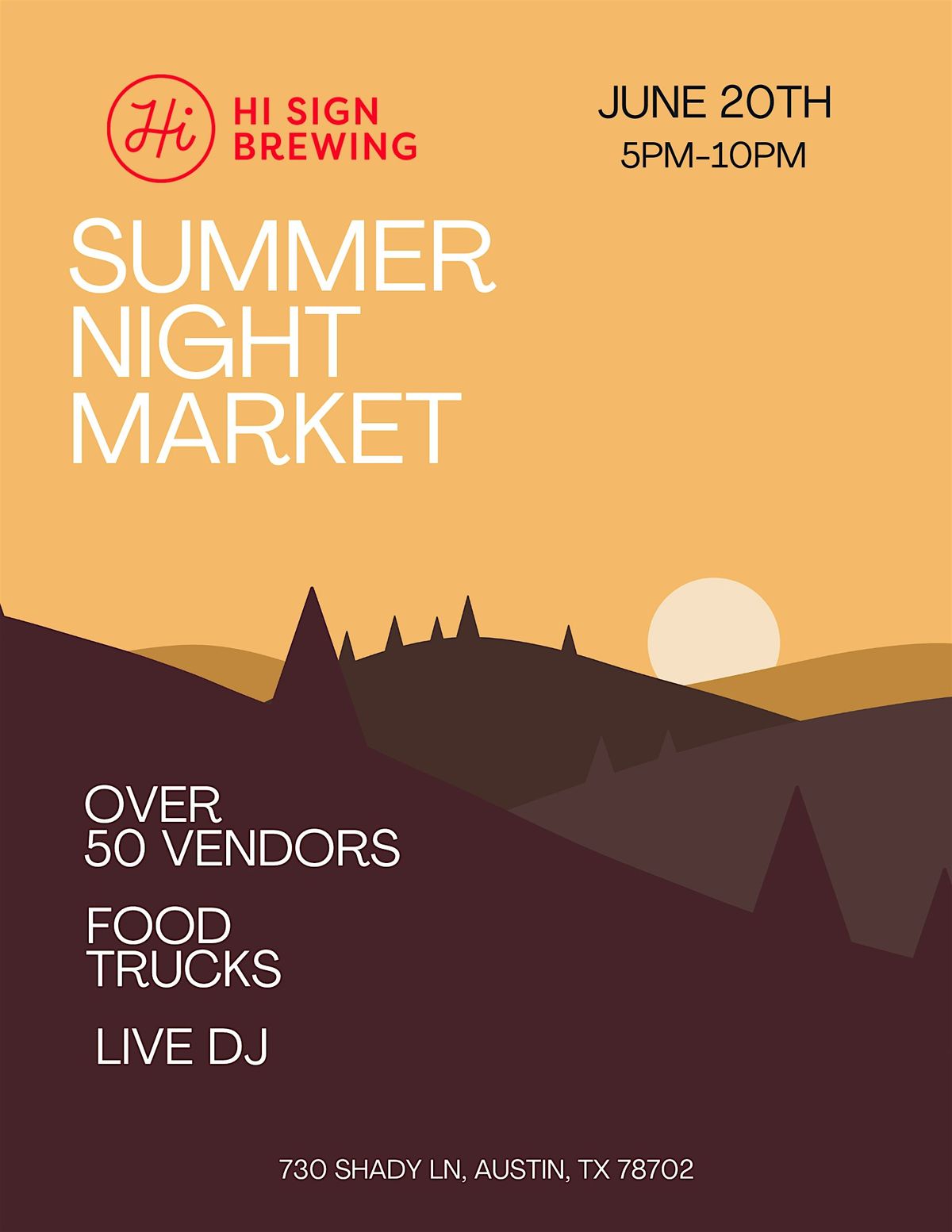 Set under the warm summer sky, guests can explore a diverse mix of vendor booths featuring handmade goods, art, apparel, and more—all while enjoying a live DJ spinning throughout the night to keep the energy high. A selection of local food trucks will be on-site serving up some of Austin’s favorite eats, perfectly paired with craft beer from Hi Sign Brewing.