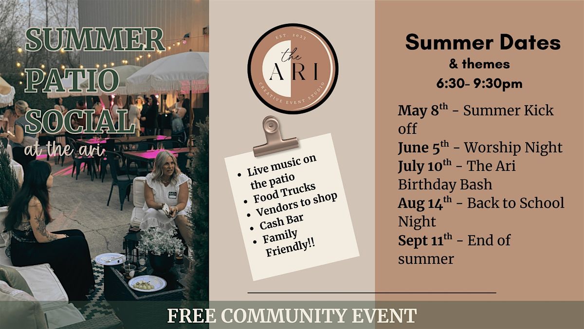 Join us for a monthly summer night out at The Ari Creative Event Studio! We’re bringing together live music, local vendors, food trucks, and patio vibes for the perfect evening to relax, shop, and connect.