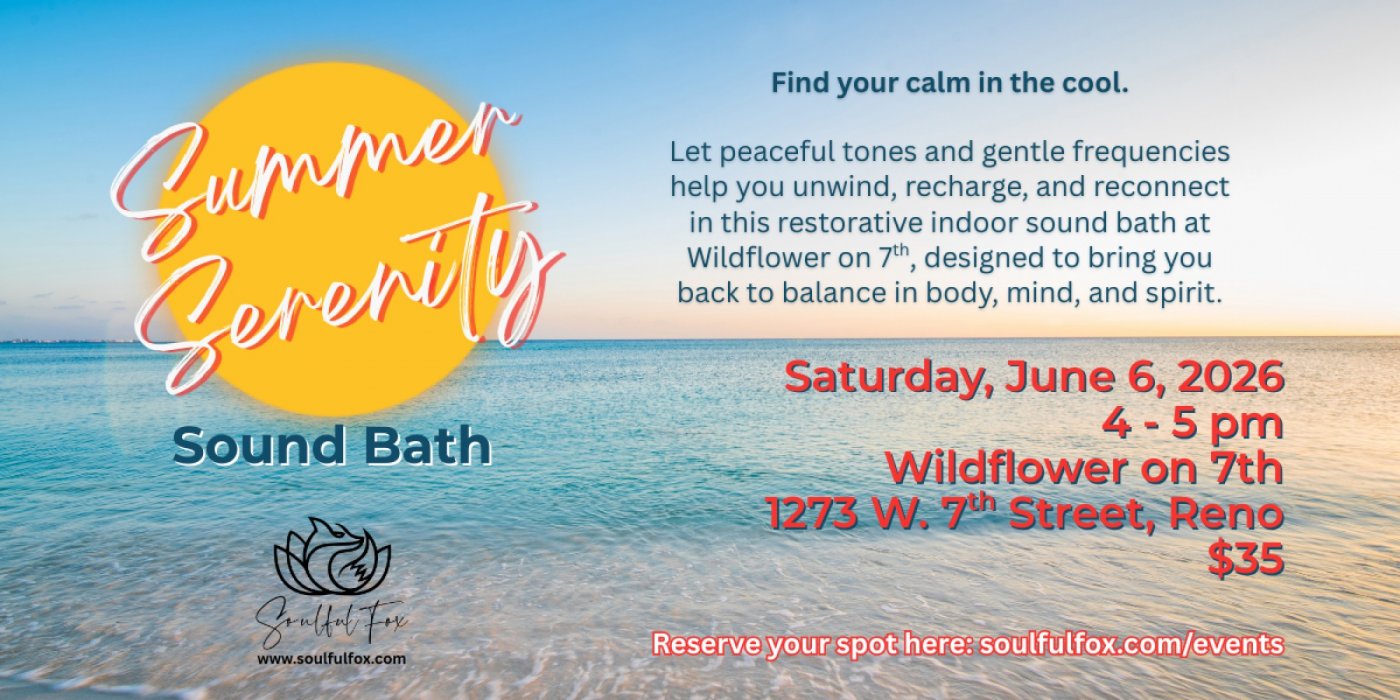 Settle in for a soothing summer sound bath with Sound Practitioner Melanie Fox at Wildflower on 7th in Reno. You’ll be guided through a deeply relaxing sound bath using crystal bowls, chimes, and other soothing instruments to support your body’s natural healing. This experience is designed to help you unwind, recenter, and restore a sense of calm from the inside out, all in the cool comfort of Wildflower on 7th in Reno.