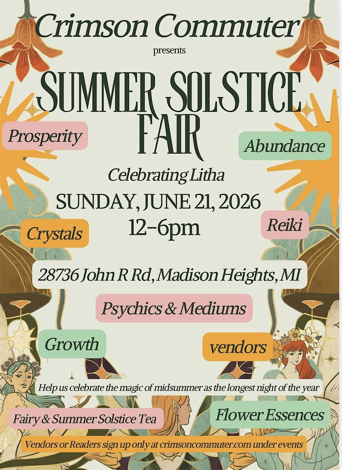 Let’s celebrate the Summer Solstice and Litha. We will have local vendors. tarot readers, psychics, & mediums. There are many items to celebrate Litha & the summer solstice such as, crystals, oracle decks, tea blends, candles, clothing , jewelry & more. This event is Free to attend each vendor or reader will charge separately at their booths. All Crimson Commuter store items are available for purchase at the front register of the store. all forms of payment available for store purchases.