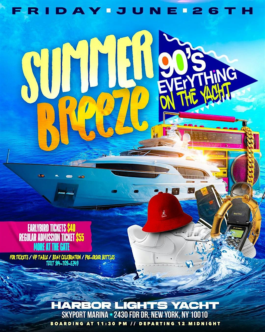 Join us for an unforgettable night at "Summer Breeze: 90's Everything on the Yacht" on Friday, June 26th, aboard the luxurious Harbor Lights Yacht at Skyport Marina, New York City. Set sail into a nostalgic 90s experience featuring a live DJ spinning your favorite hits, dazzling views of the city skyline, and a vibrant atmosphere reminiscent of the iconic decade.