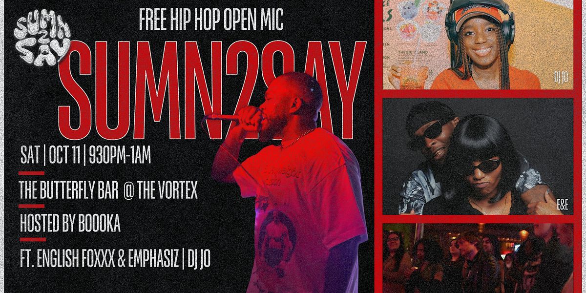 SUMN2SAY is a vibrant, late-night open mic showcase in Austin, Texas, providing a platform for emerging voices in hip-hop and welcoming of all genres. Held at The VORTEX, a renowned venue for experimental and community-driven performances, SUMN2SAY fosters a creative space for artists to express themselves and connect with audiences. Join us for a night of music, drinks, and much more!