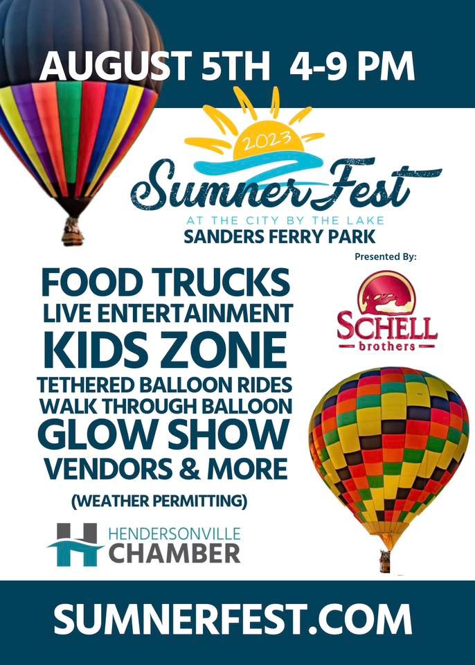 Join us for the fourth annual Sumner Fest at Sander's Ferry Park on Old Hickory Lake. Activities will be near Pavilion #8. Entrance to the park and festival is free and open to the public. There will be on site parking.There will be a Kid Zone where parents may purchase passes. Weather permitting there will be tether balloon rides. Balloon rides will be available for one hour. The start time will be dependent on the direction of the wind and be determined the afternoon of Sumner Fest.