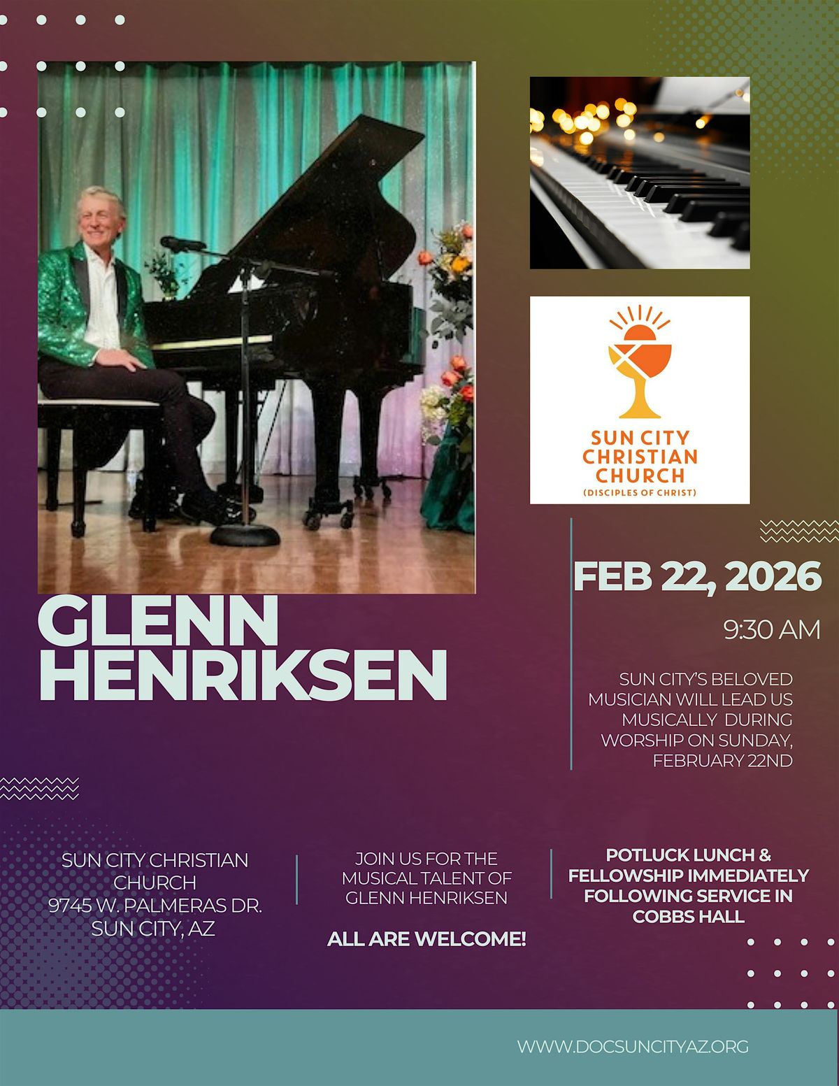 Join us at Sun City Christian Church on February 22nd at 9:30 am as our worship music will be performed by the beloved Glenn Henriksen. Glenn is an accomplished pianist/organist and inaugurated into the Iowa Rock and Roll Hall of Fame. We are very excited to be able to be led musically during worship by his music. Immediately following service we will enjoy fellowship and a potluck lunch.... ALL ARE WELCOME!