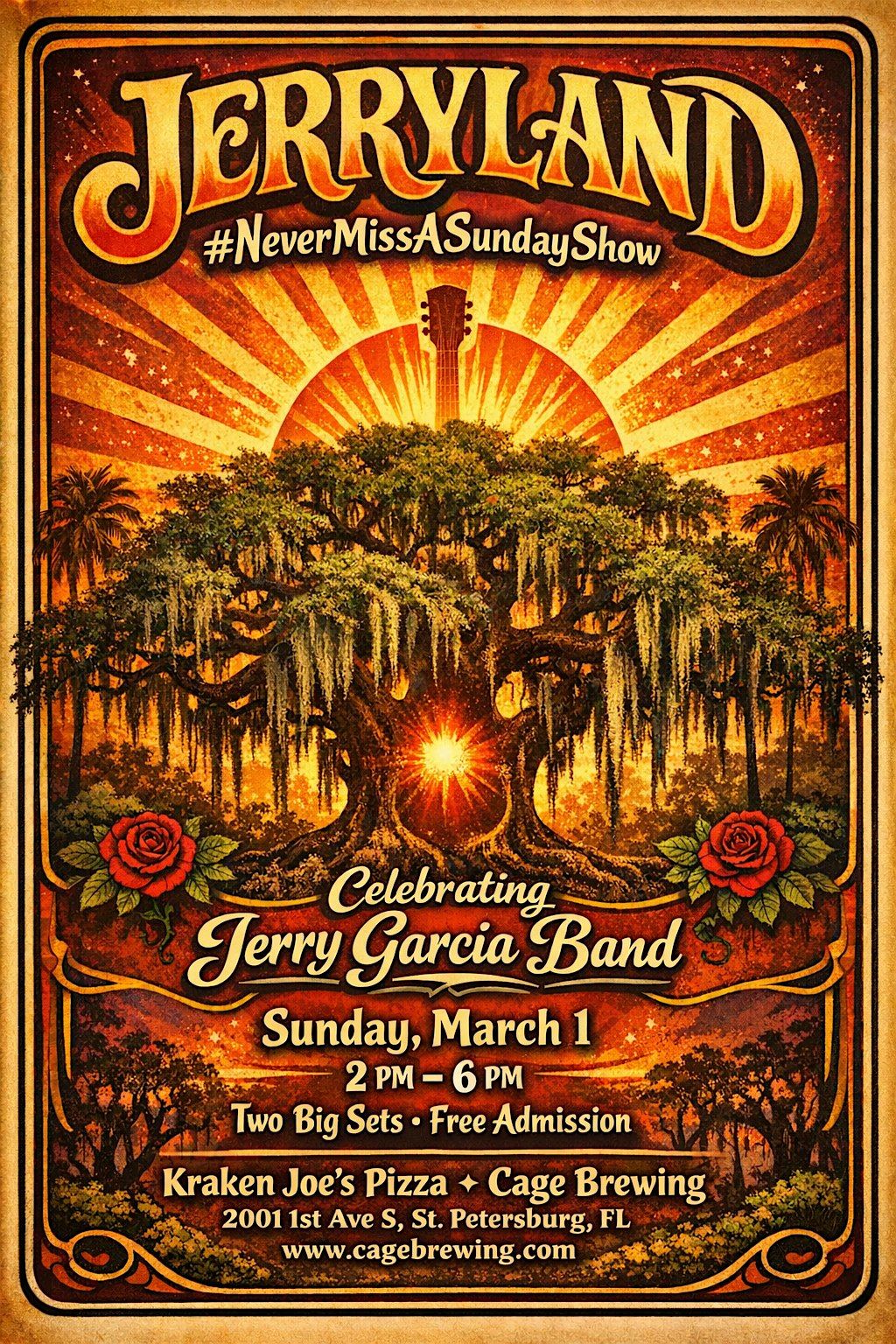 JERRYLAND IS BACK #NeverMissASundayShowSunday, March 1 from 2 PM – 6 PM we’re celebrating the soulful magic of the Jerry Garcia Band with TWO BIG SETS of pure Sunday afternoon groove.Golden sun. Moss in the trees. Cold beers in your hand. Pizza coming hot out of the oven. That laid-back backyard energy only happens at Cage. Sunday, March 1 2 PM – 6 PM Two Big Sets Free Admission Kraken Joe’s Pizza at Cage Brewing2001 1st Ave S, St. Petersburg, FL cagebrewing.com krakenjoespizza.comBring your crew. Bring your dancing shoes. Bring that Sunday spirit.Let’s turn the backyard into Jerryland. #Jerryland #NeverMissASundayShow #CageBrewing #KrakenJoesPizza #StPeteMusic #StPeteEvents #SundayVibes #LiveMusicStPete #JerryGarcia #JGB #DeadheadFamily
