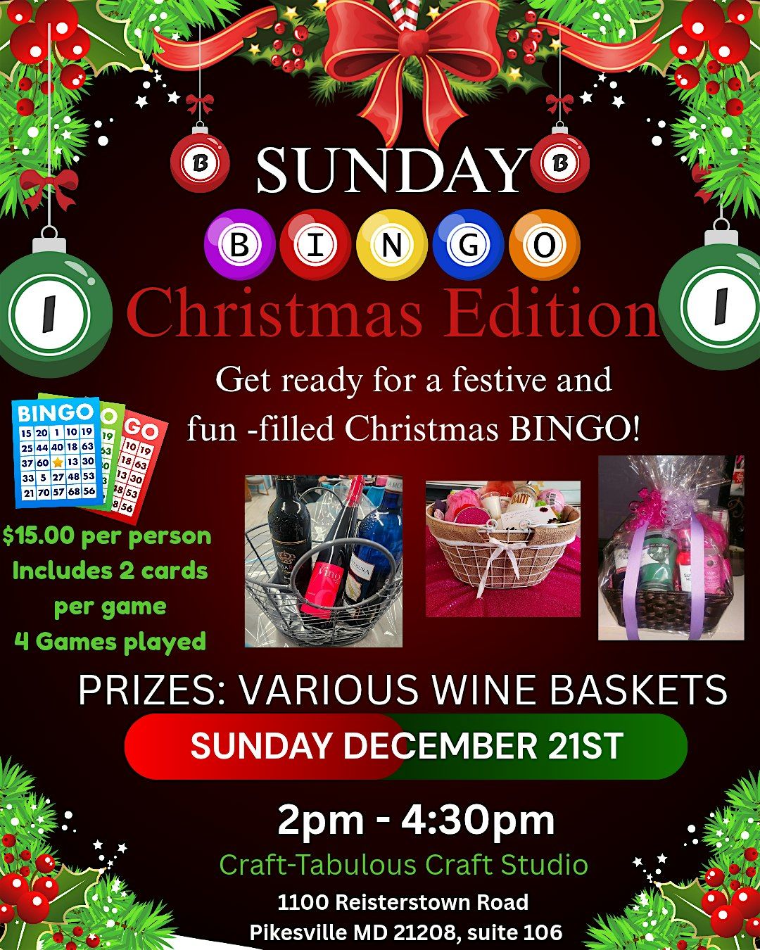 #ChristmasBingo #SundayFun #HolidayVibes #CraftTabulous #BingoNight #FestiveFun #WineBasketPrizes #HolidayEvents #PikesvilleMD 🎄🍷🎯
