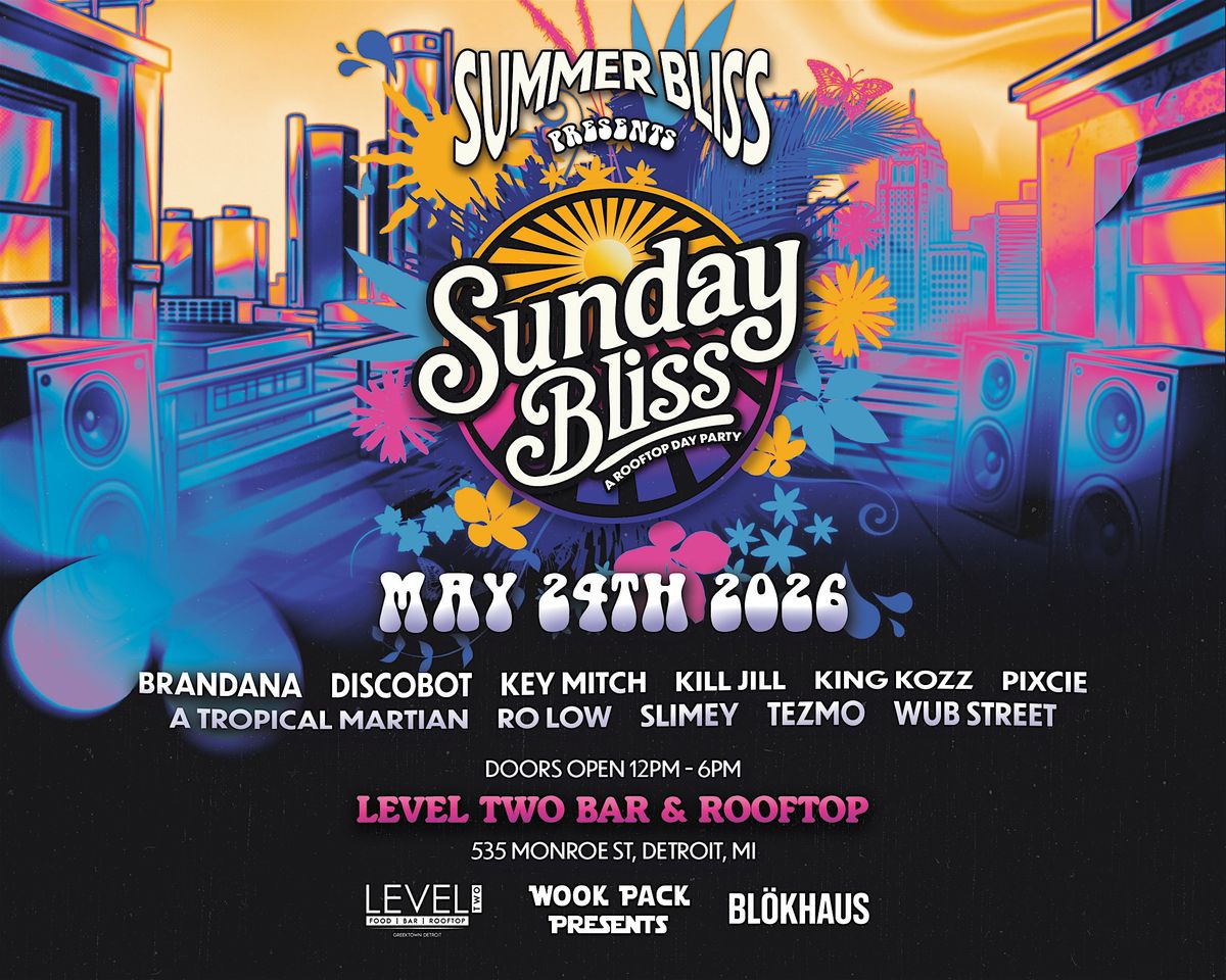 Sunday Bliss Rooftop Day Party returns on Sunday, May 24th at Level Two Bar & Rooftop for a high-energy day into night experience during Detroit Techno Weekend.