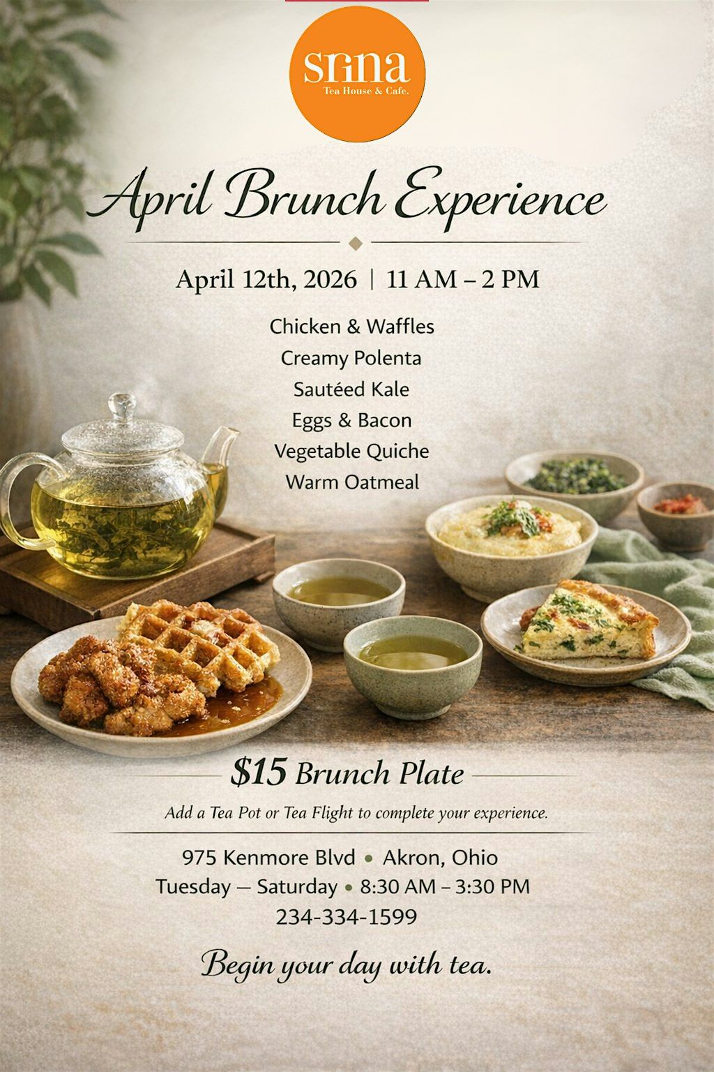 Join us for a Spring Brunch at Srina Tea House and Cafe. First Guests receive complimentary tea house gift.