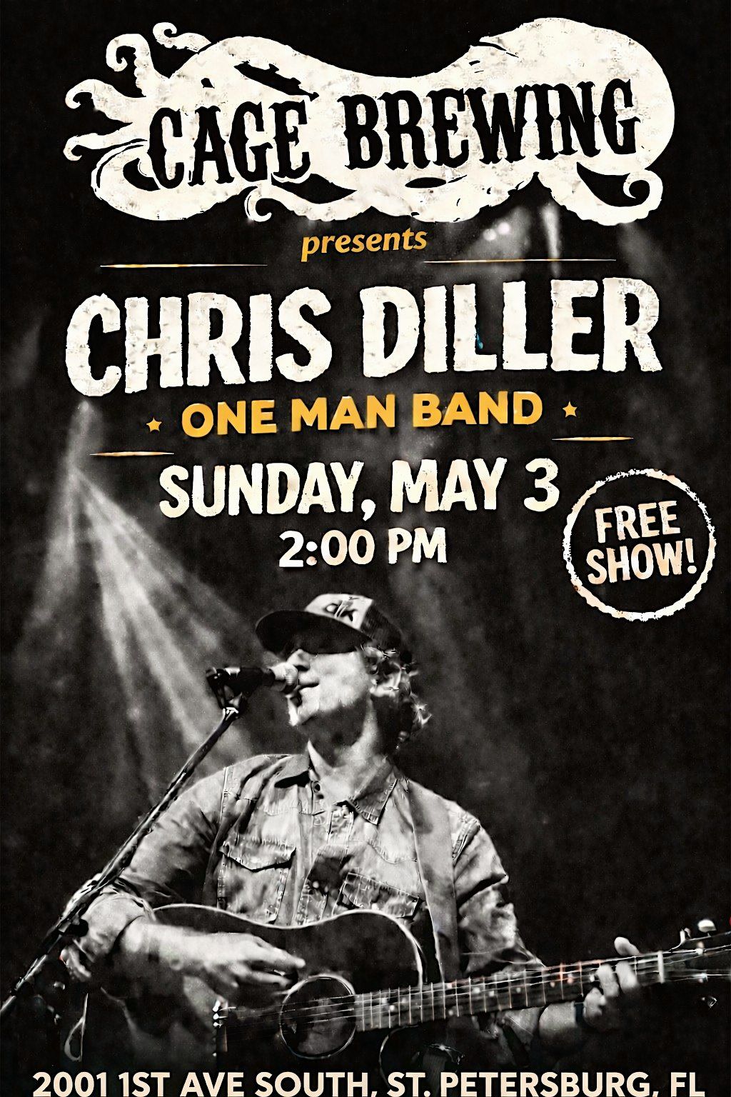 Get ready to kick back and enjoy some awesome live tunes with Chris Diller at Cage Brewing right in the heart of St. Pete, FL. This in-person gig is all about good vibes, great music, and a chill Sunday afternoon. Don’t miss out on the fun—come hang, sip some brews, and soak up the sounds!