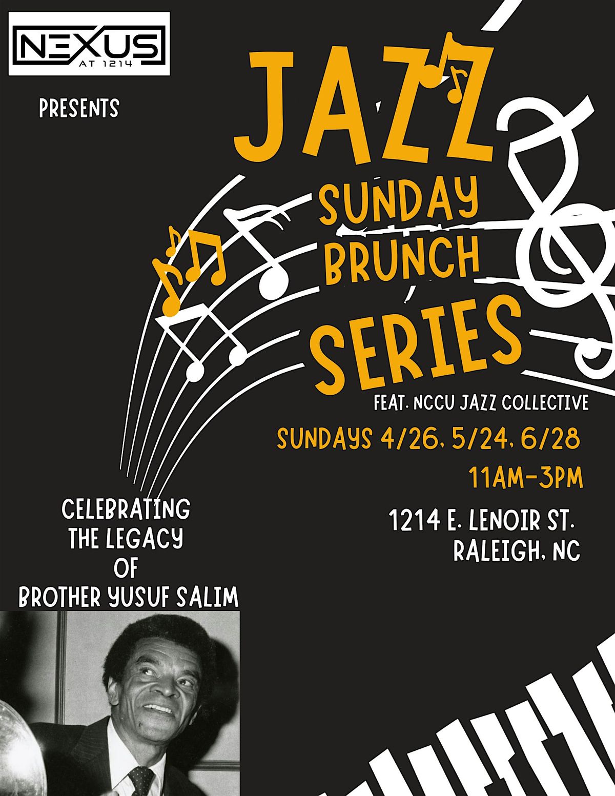 Come vibe with us in person for a chill Sunday filled with smooth tunes from the NCCU Jazz Ensemble. We're celebrating the incredible YUSUf Salim Jazz Legacy with some fresh, soulful sounds that you won't want to miss. Bring your friends, grab some good food, and soak up the awesome jazz atmosphere. It's the perfect way to kick back and enjoy your weekend!