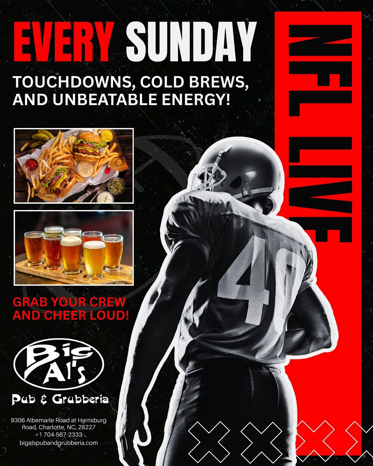 Get ready for an epic Sunday NFL night at BIG AI PUB! Join us in person to catch all the live action on big screens with great vibes and awesome company. Whether you're rooting for your favorite team or just love the game, this is the spot to be. Bring your friends, grab your favorite drink, and let's make Sundays legendary!