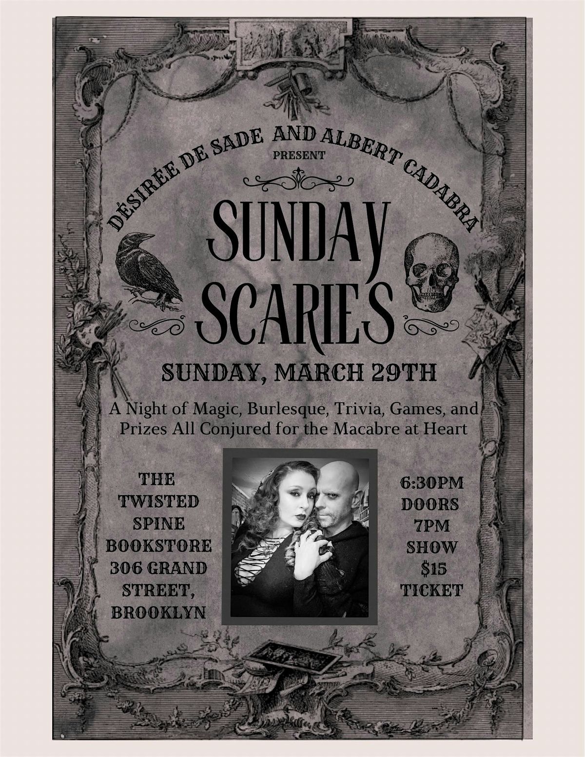 Looking for a way to stave off those SUNDAY SCARIES? Let Désirée De Sade and Albert Cadabra take you on a journey into the strange and unusual as they possess Brooklyn's newest spooky sensation, The Twisted Spine Bookstore In Williamsburg and entertain you with their unique brand of sideshow, magic, and burlesque, but be forewarned, wherever Désirée goes, you can expect a heavy dose of bad jokes.
