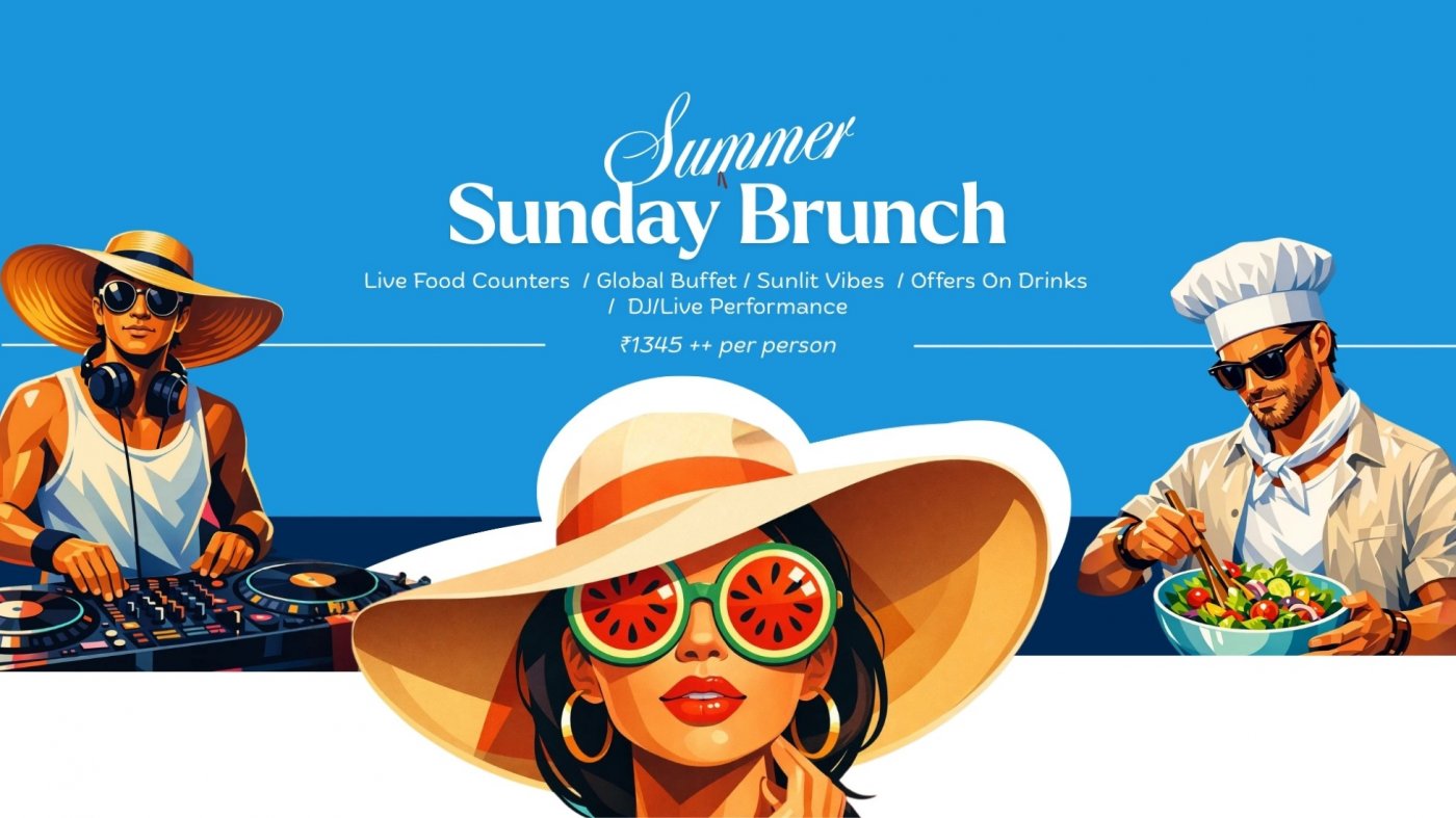 Make your Sundays brighter with a refreshing Sunday Summer Brunch! Indulge in a vibrant 5-course global buffet, exciting live kitchen stations, refreshing summer drink offers, and lively beats with a Live DJ—all for just ₹1345 + taxes per person.