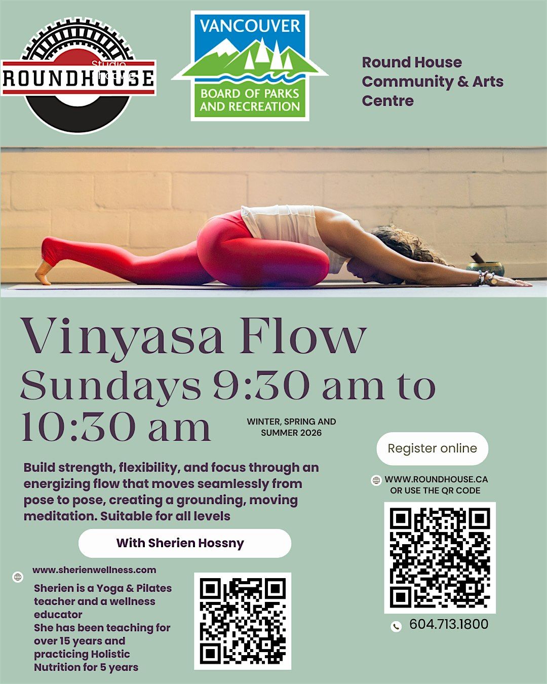 This is a recurring event - weekly sunday flow yoga at round house community center , registrartion and tickets sale via Round House community and arts center either online or by calling or visiting, drop in available classes starts on February 22nd and end March 29th, more classes will be added through out the summer. It is not a free event but you can only register via round house community center