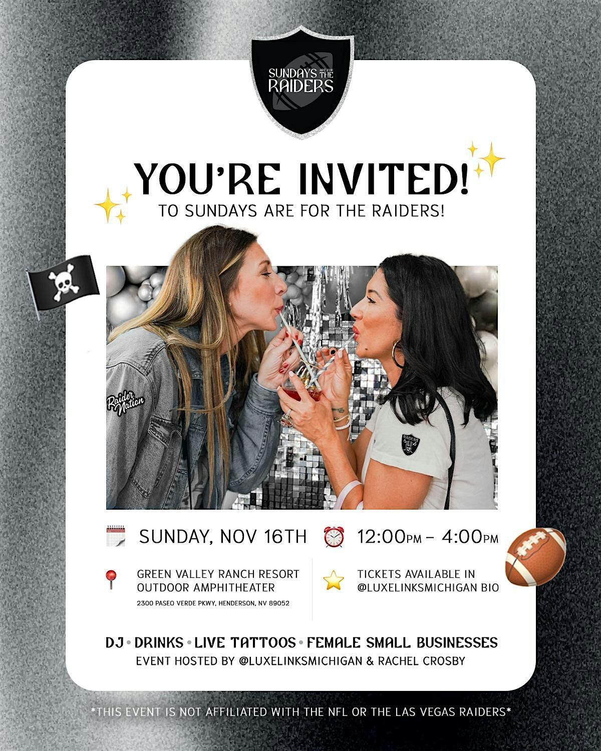 The Sundays Are for the Raiders Market is a vibrant event that celebrates Raider Nation while supporting female owned small businesses. Featuring live tattoos, photo ops, a DJ, female vendors and team spirit, the market creates an energetic space where community, girl power and gameday vibes collide.