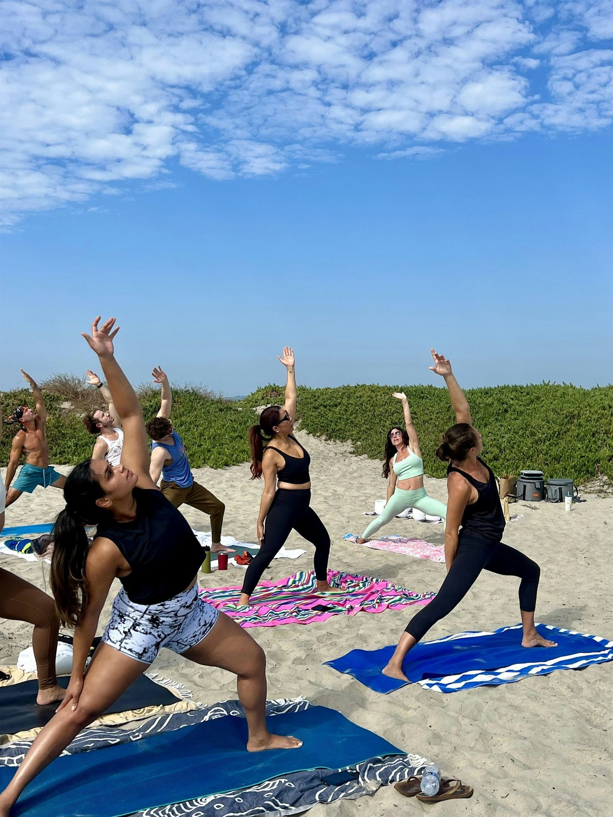 We meet on the sand in front of the bathrooms on Coronado Beach North Shore to the left of the Fire Pits & Dog Beach next to Lifeguard Tower 6C close to the water front.