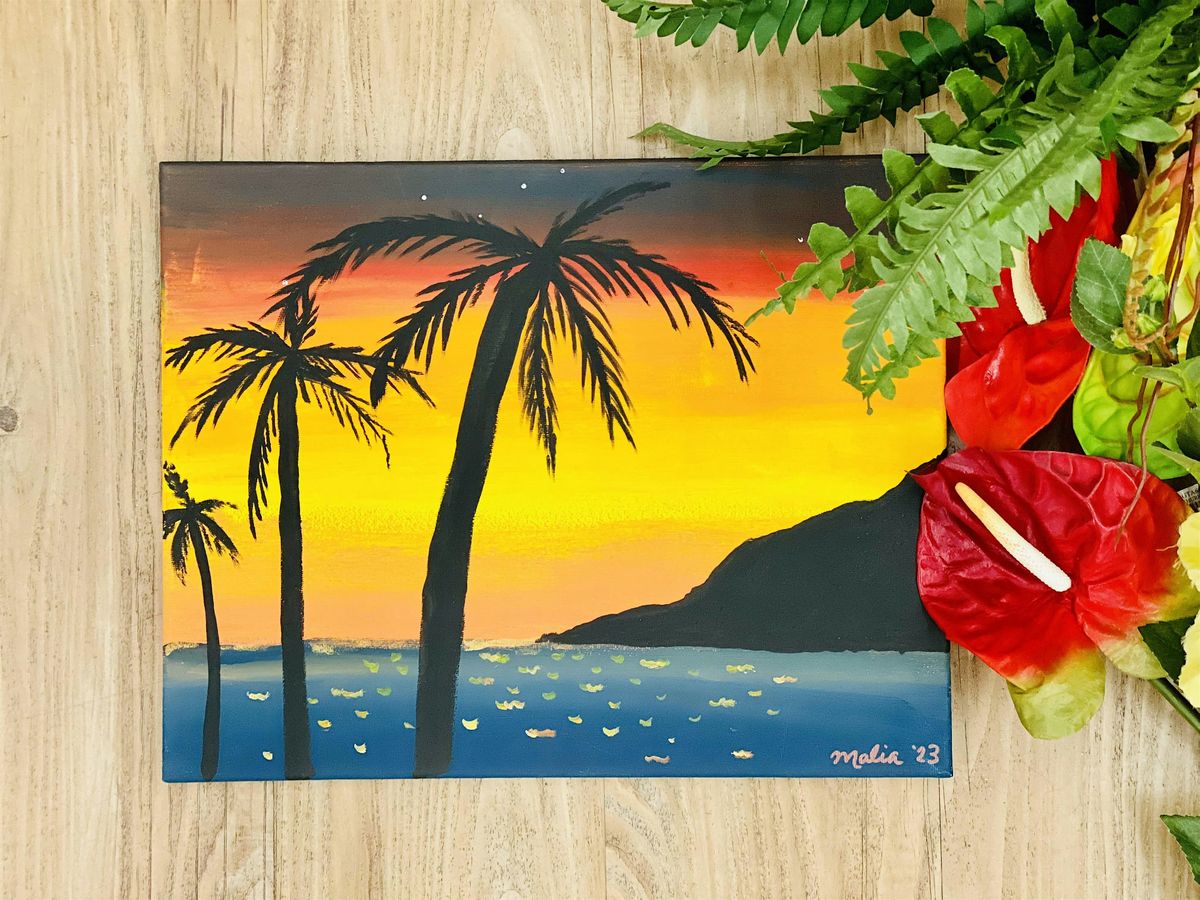 Join Malia for a calm and creative two hours of painting and appreciating the west side of the island of O'ahu. Learn how to blend your favorite acrylic sunset colors into a magnificent backdrop to the slopes of the Wai'anae mountain range, as silhouettes of South Shore palm trees set a frame from your view.