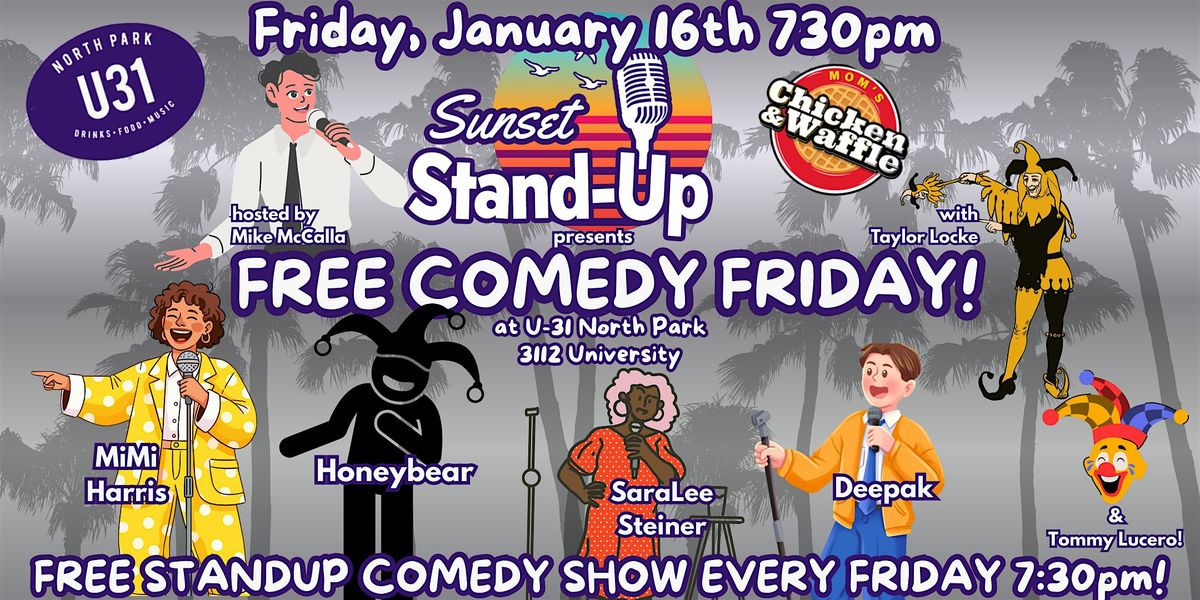 Come join us for a night of laughter at U-31 on University Avenue in San Diego! Hosted by Mike McCalla, this in-person event on January 16th promises (but doesn't guarantee) to be a night to remember. Grab your friends, grab a drink, and get ready to laugh! See you there!