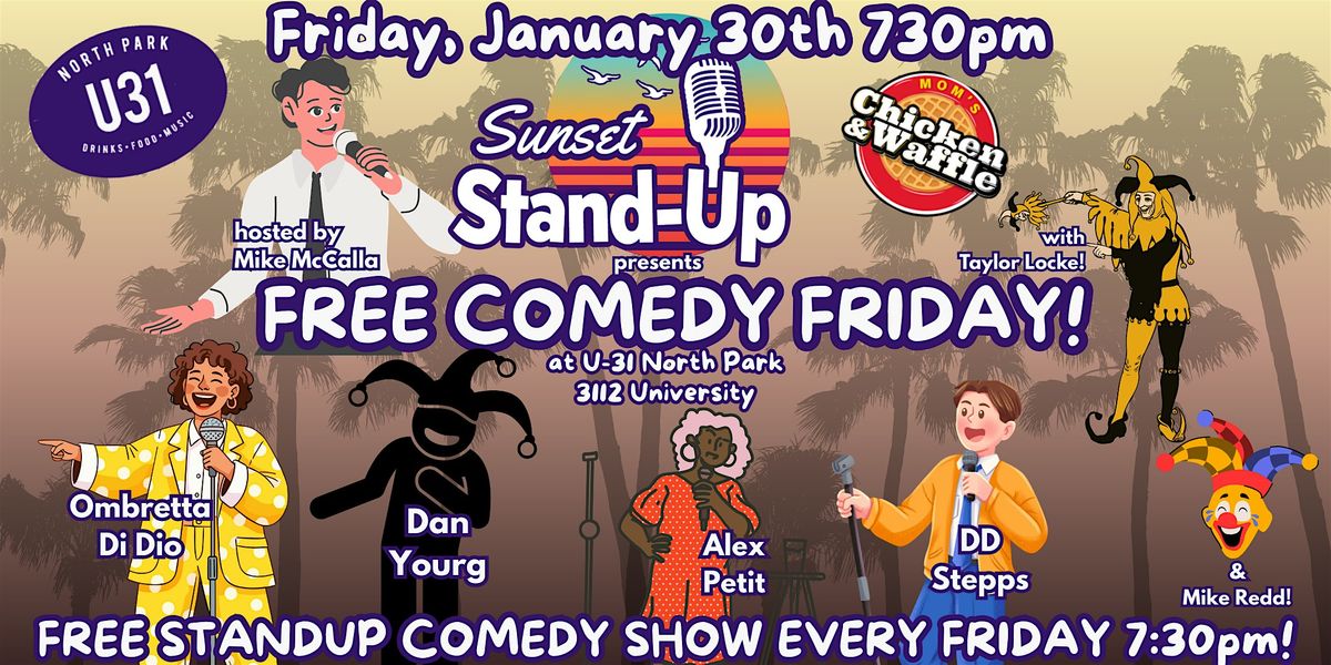 Come join us for a night of laughter at U-31 on University Avenue in San Diego! Hosted by Mike McCalla, this in-person event on January 30th promises (but doesn't guarantee) to be a night to remember. Grab your friends, grab a drink, and get ready to laugh! See you there!