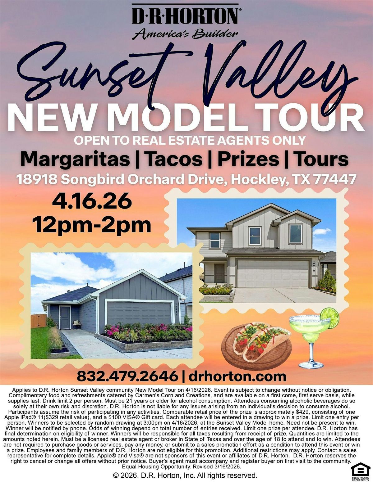 REALTORS! Join us in Sunset Valley by D.R. Horton for a first look at our new model home! Enjoy, lunch, margaritas, and stunning new homes!