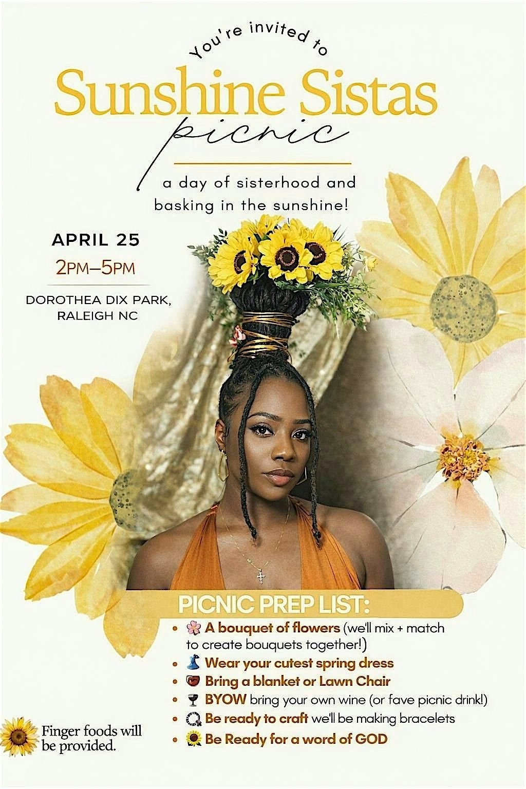 Hey there! Join us for the Sunshine Sisters Picnic, a fun and relaxed in-person hangout filled with laughs, good vibes, and tasty treats. Bring your favorite snacks, a blanket, and your sunny spirit! Let's make some great memories together under the warm sun. Can't wait to see all the wonderful Sunshine Sisters!