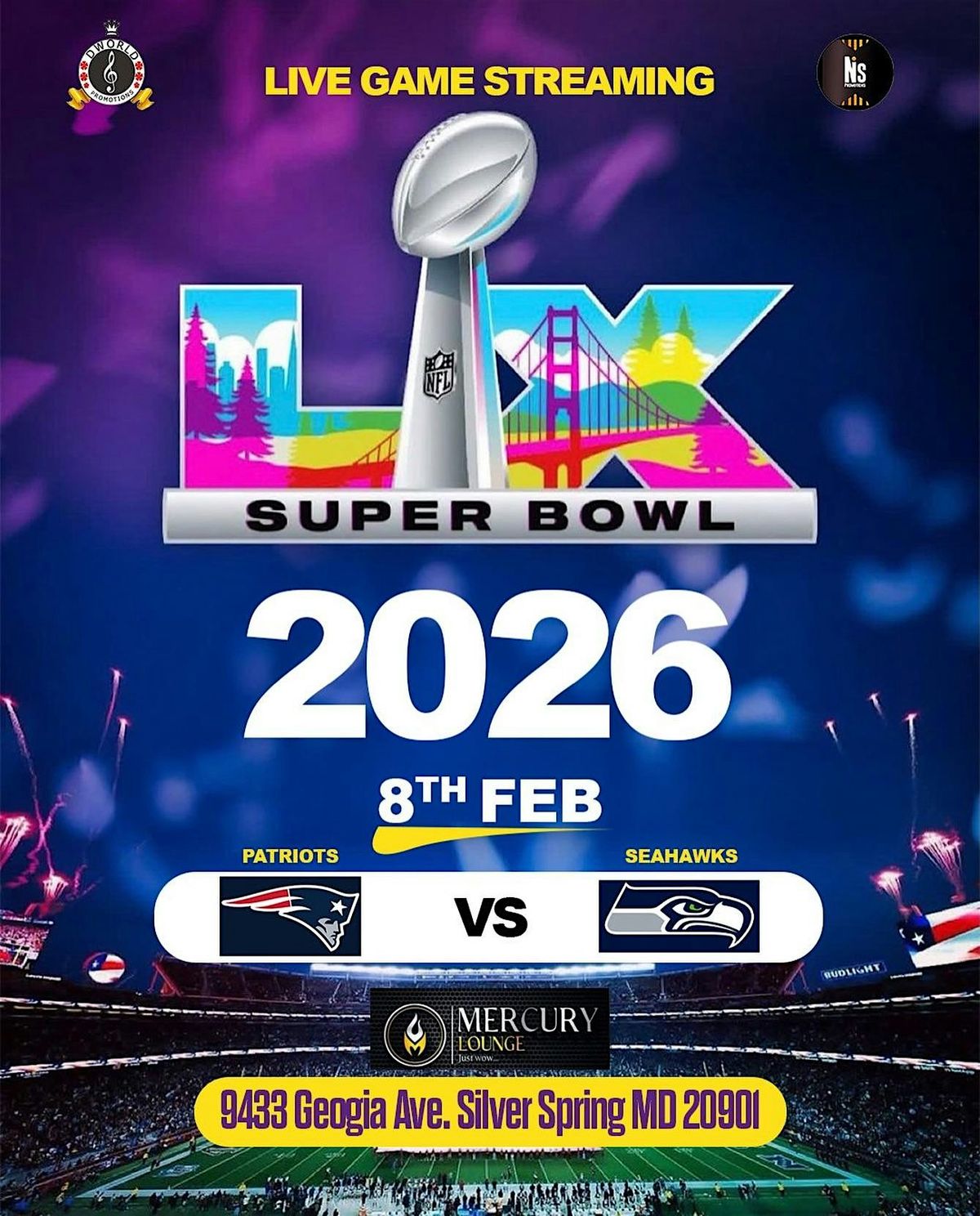 This isn’t just a watch party — it’s a full‑on Super Bowl experience. Bring your friends, rep your team colors, and settle in for the most exciting game of the year.