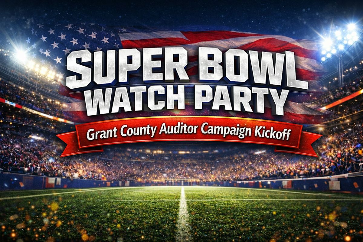 Join us this afternoon for the official kickoff of Andrew Koeppen’s campaign for Grant County Auditor while enjoying the Super Bowl in a family-friendly setting. Doors open at 3:00 PM for an afternoon of football, community, and conversation.