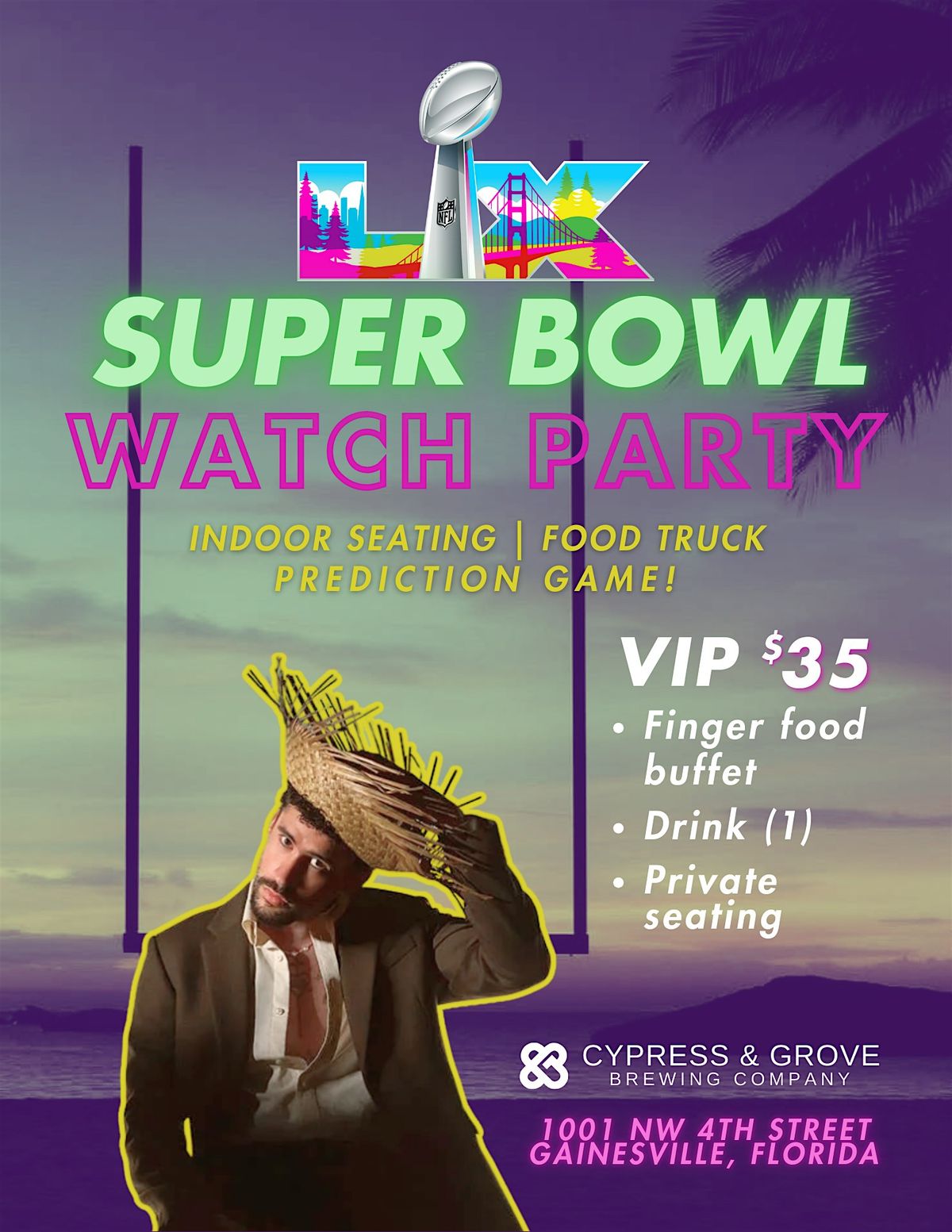 Enjoy a VIP experience of the Big Game at Cypress & Grove! One ticket includes a reserved seat in our private event room and a buffet of gameday finger foods by Stubbies Sausages. Catch every minute of the game and Apple Music Halftime Show featuring Bad Bunny.