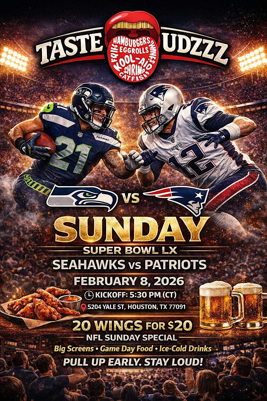 Welcome football fans! Get ready for an epic showdown at Super Bowl NFL Patriot vs Seahawks on February 8, 2026 at Taste budzzz sport bar and grill. Join us for a night of intense competition and excitement. Don't miss out on the action starting at 5:30 PM (Central Time). Grab your friends and come cheer for your favorite team! See you there!
