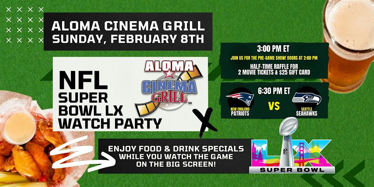 Football Fans! Join us for our 🏈 SUPER BOWL SUNDAY Watch Party 🏈 on Sunday, February 8th from 3:00 pm - 10:00 pm at Aloma Cinema Grill! RSVP your party NOW and watch the BIGGEST game of the year, LIVE on the BIG screen with fellow fans! Enjoy 🍔 food and drink 🍺 specials from our full menu and full bar and catch all the football action you can handle. $5 Draft Pints, $6 Nachos, $6 NÜTRAL Vodka Seltzer, $8 Spiked Sweet Tea, $10 for 10 Wings and $10 12" Cheese Pizza!