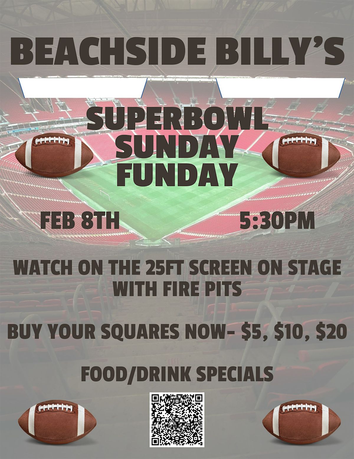 We'll also have Super Bowl squares available for purchase in-house for $5, $10, and $20, plus game-day specials to keep the party going from kickoff to final whistle.
