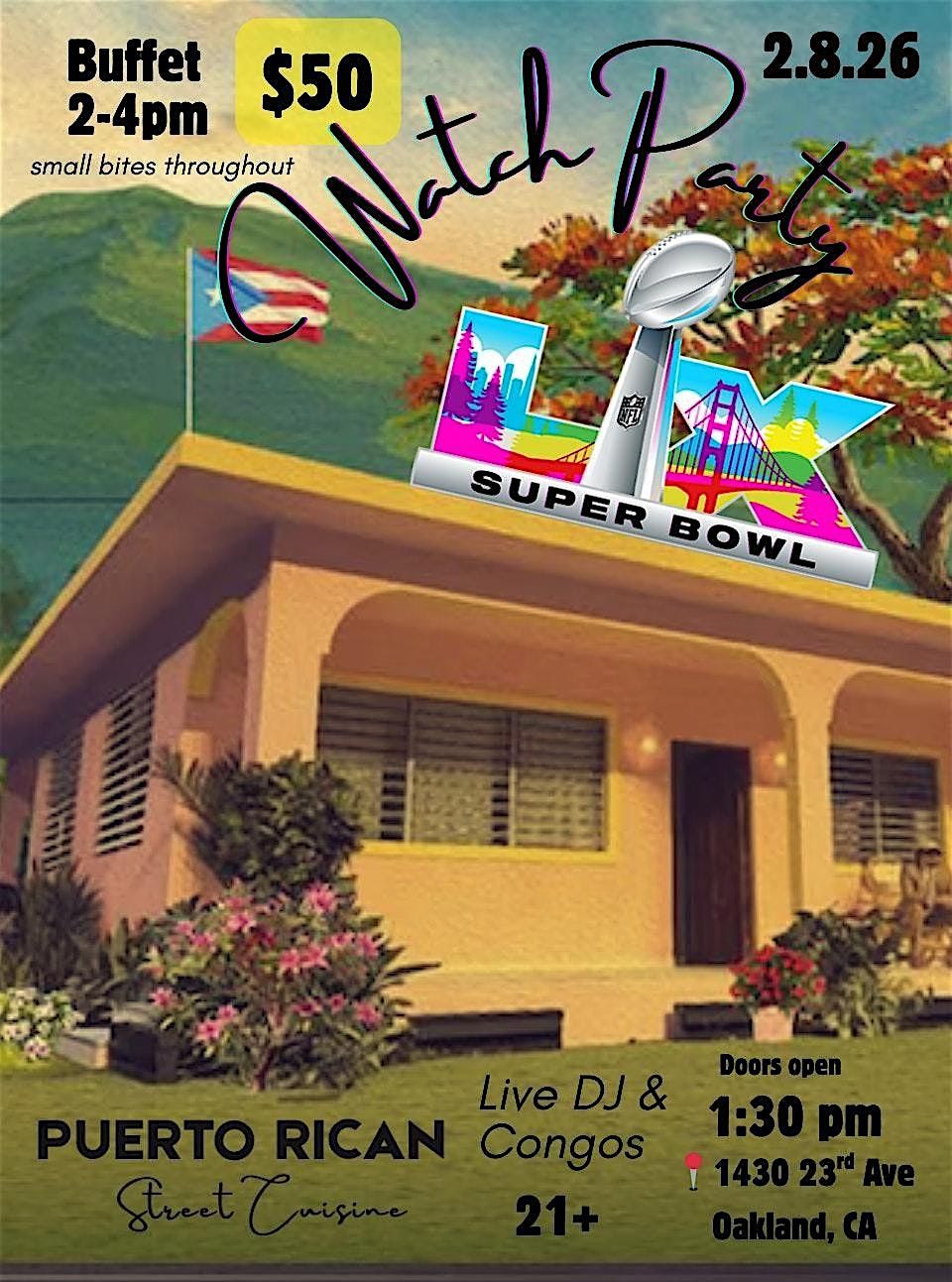 SBLX w/all the Boricua vibes! Bad Bunny at halftime, live DJ w/ congos, a 2 hr buffet, bar, small bites throughout and pinchos on the grill!