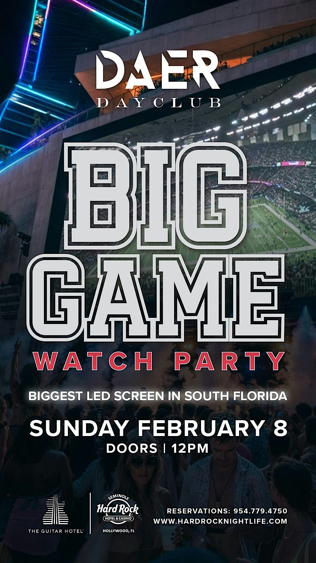Welcome to the Super Bowl Watch Party at Dayclub Daer, home to the Biggest Screen in South Florida! Get ready for an epic game day experience at DAER Dayclub on February 8, 2026 at 12:00 PM (Eastern Time). Join us for a day filled with football, fun, and friends. Don't miss out on the excitement!