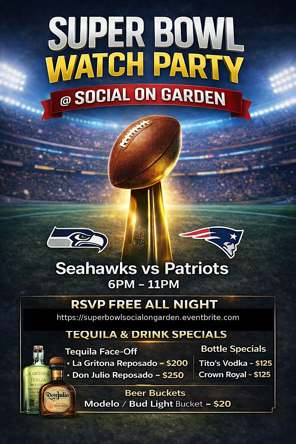 Get ready to cheer, laugh, and make memories at our Super Bowl Watch Party! Join us in person for all the excitement of the big game SEAHAWKS vs PATRIOTS! Bring your friends, grab some food, and let's make this game day one to remember. Don’t miss out on the fun – see you there!