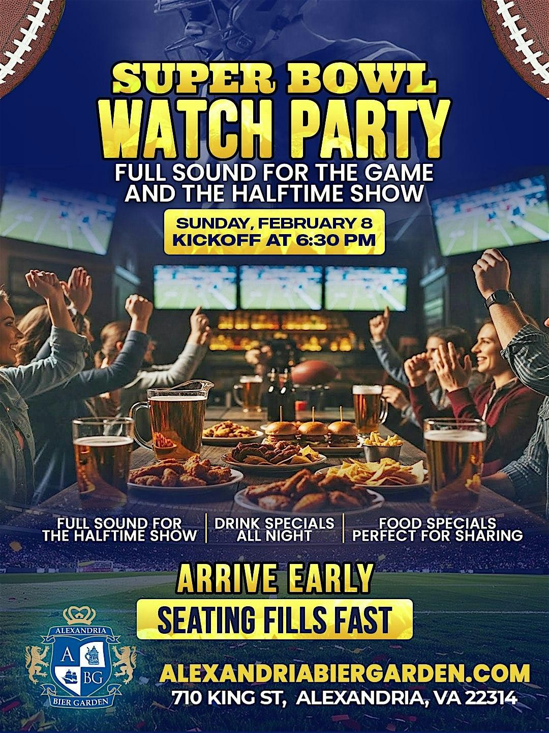 Join us at Alexandria Bier Garden, located at 710 King Street, Alexandria, VA, for the ultimate Super Bowl Watch Party on Sunday, February 8th! Cheer for your favorite team on our big screens in an electric game-day atmosphere.