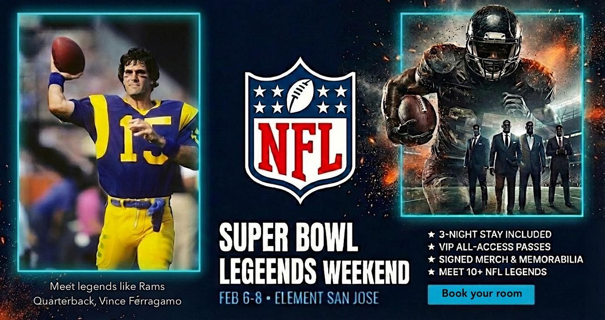 Don't just watch the game, live it with the pros. Take Back The Neighborhood (TBTN) invites you to an exclusive 3-day takeover of the Element San Jose. Every room booking includes VIP Access passes for 4-6 guests. Access to NFL Legends from February 6th - February 8th. Get signed memorabilia, free merchandise, and jerseys. Special guest appearance of Odeen Mays of Kool & the Gang.
