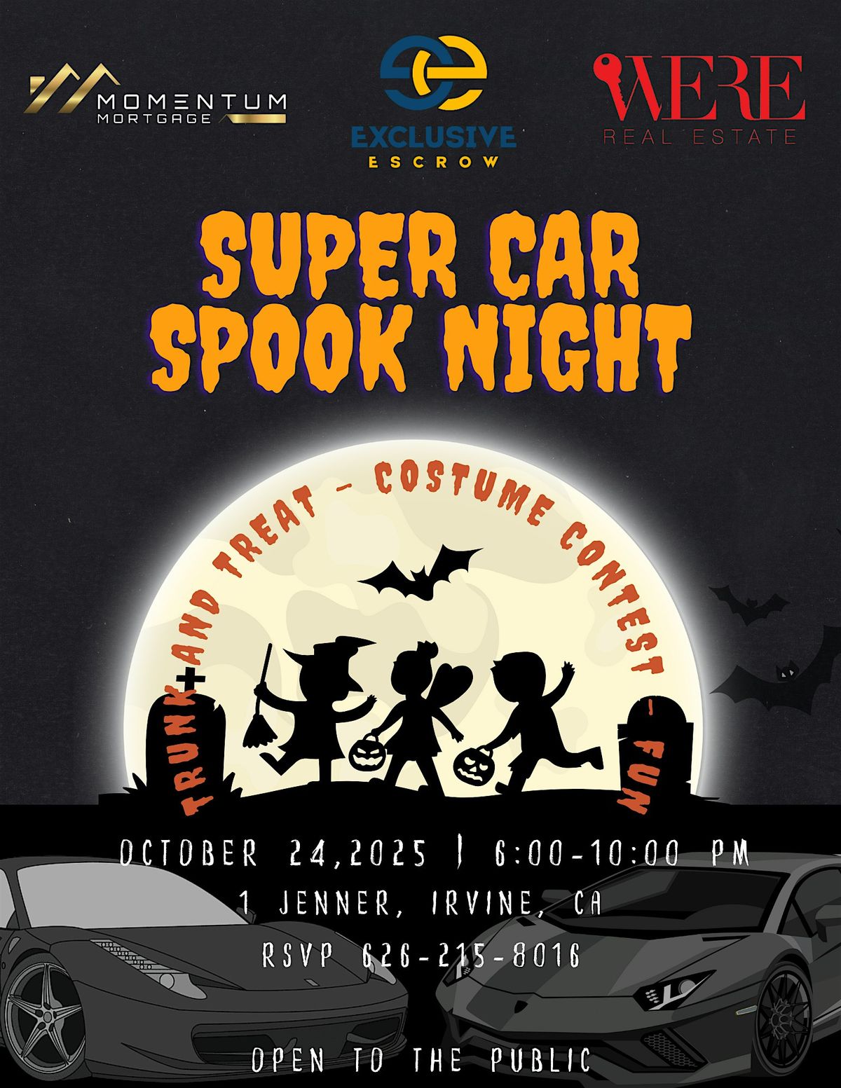 Welcome to Super Car Spook Night! Get ready for a family fun filled night with exotic cars, networking and spooky fun at 1 Jenner, Irvine, CA. Join us for a thrilling evening of admiring some of the most impressive cars around, all while getting into the Halloween spirit. Dress up in your best costume to enter a costume contest. We will have food vendors, face painting, and chances to win prizes. Enjoy the sight of these incredible vehicles under the moonlight. Don't miss out on this unique combination of luxury cars and spooky vibes. See you there!