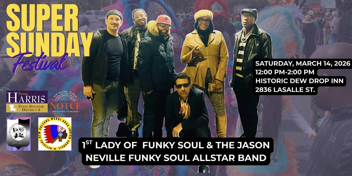 Kick off Super Sunday weekend with a high-energy brunch experience honoring the legendary legacy of the Super Sunday Festival. Featuring the powerful sounds of the 1st Lady of Funky Soul alongside The Jason Neville Funky Soul Allstar Band, this event brings together the spirit of New Orleans music, community, and culture in one iconic space.