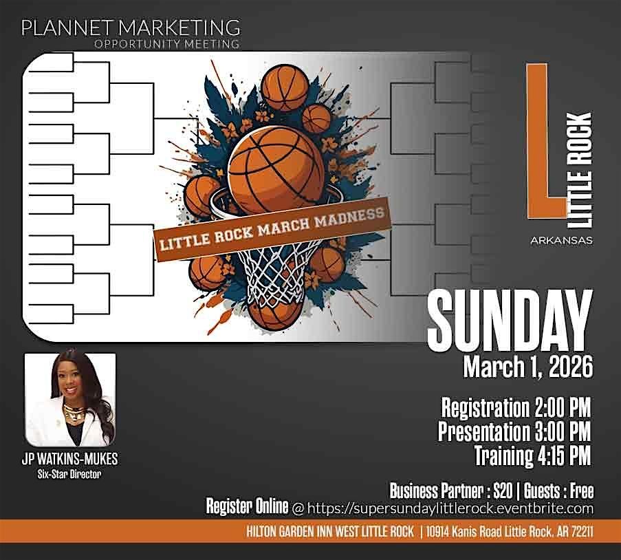 Little Rock join PlanNet Marketing leaders at Hilton Garden Inn Little Rock West for an opportunity meeting and advanced training event. Registration 2:00 p.m. • Presentation 3:00p.m.• Training 4:15p.m. Business Partners $20.00 advance online/Guests free. No refunds/transfers!!!!