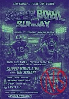 Bookings recommended AND TICKETS PRICED AT £5 and the first 13 will be instantly be entered into a BLIND Sweepstake to win a £50 Bar tab if your team wins the superbowl!