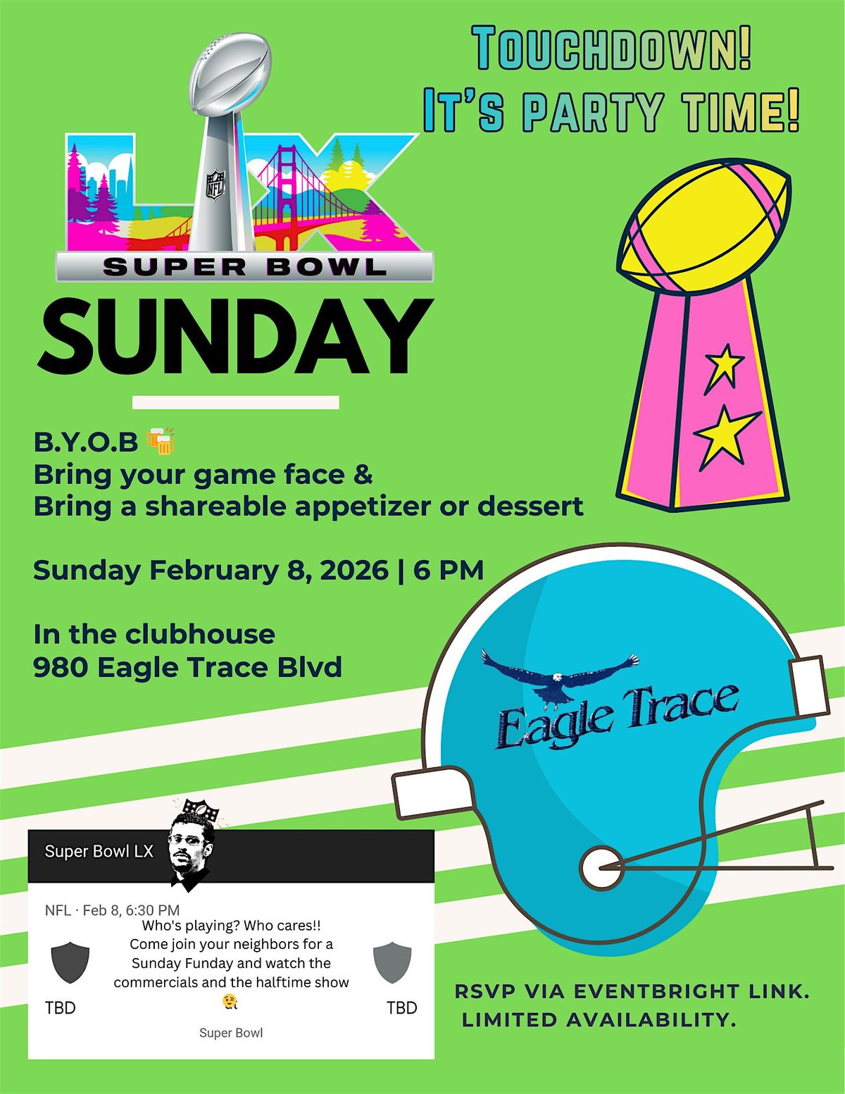 Get ready for an epic evening of football, food, and fun! Join us in the clubhouse to catch all the action live on the TV screen. Whether you're here for the game, the commercials, or just the good vibes, this is the place to be. Bring your friends, your cheers, and a shareable snack!