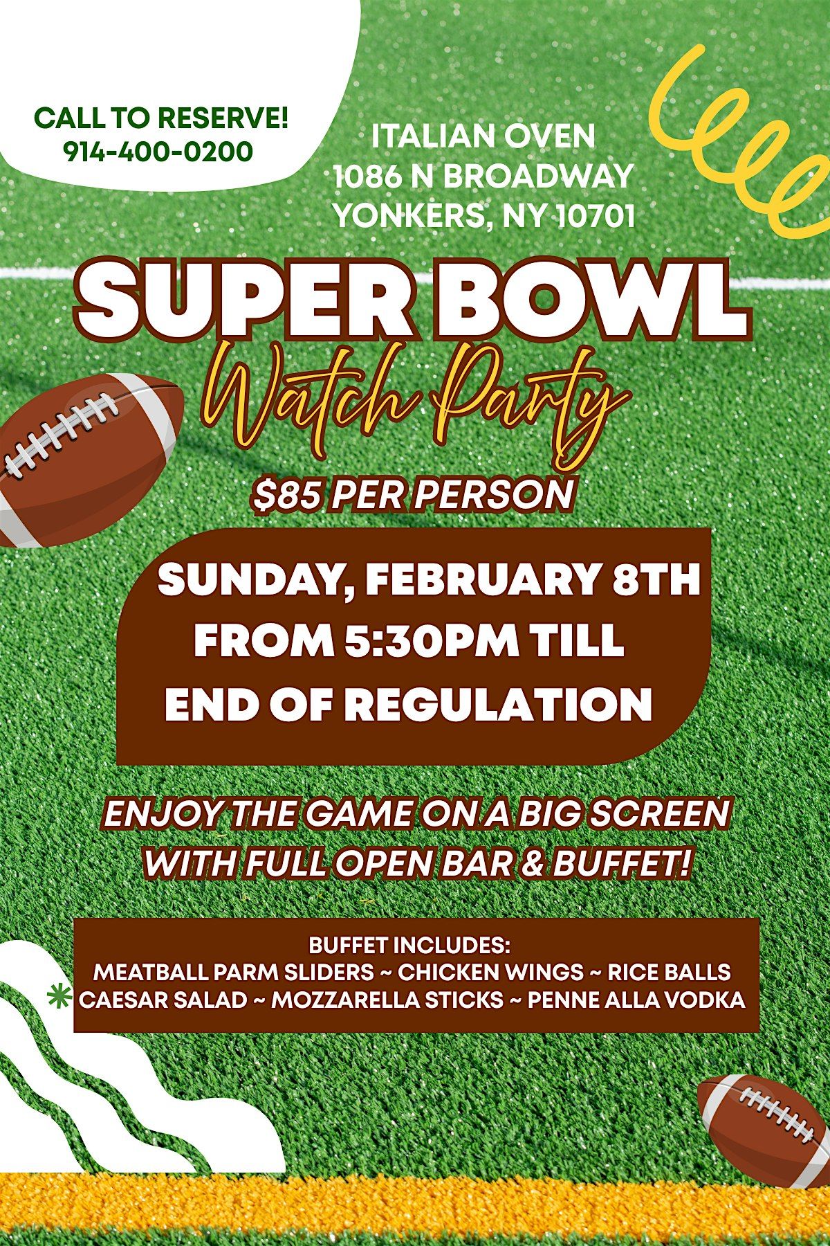 Sunday, February 8th from 5:30pm til the end of regulation. Enjoy the game on a big screen with full open bar and buffet! $85 per personAbout this Event