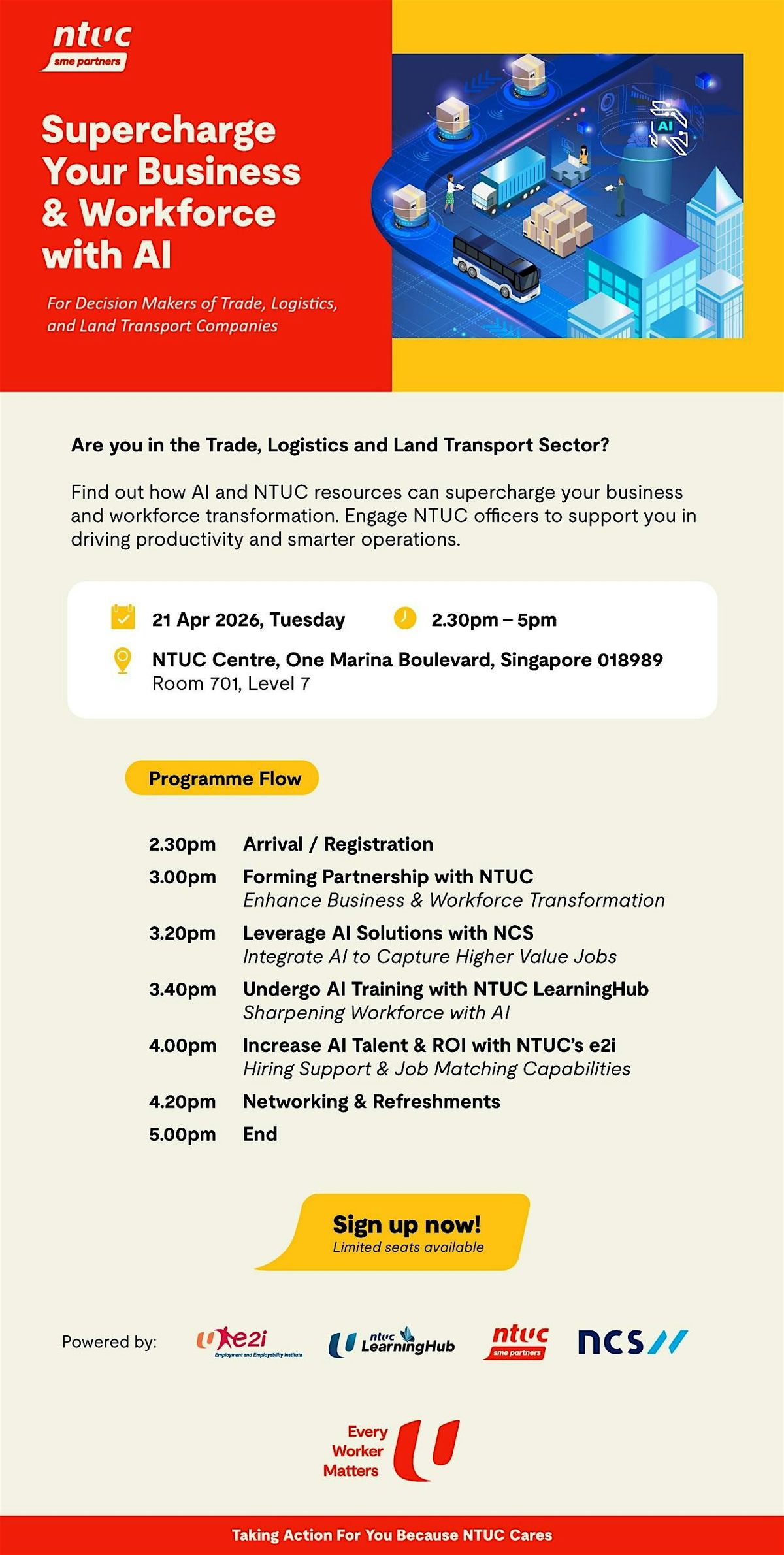 Join NCS, NTUC's e2i , NTUC LearningHub, and NTUC SME Partners to understand how Trade, Logistics, and Land Transport companies can supercharge your business and workforce transformation with AI.