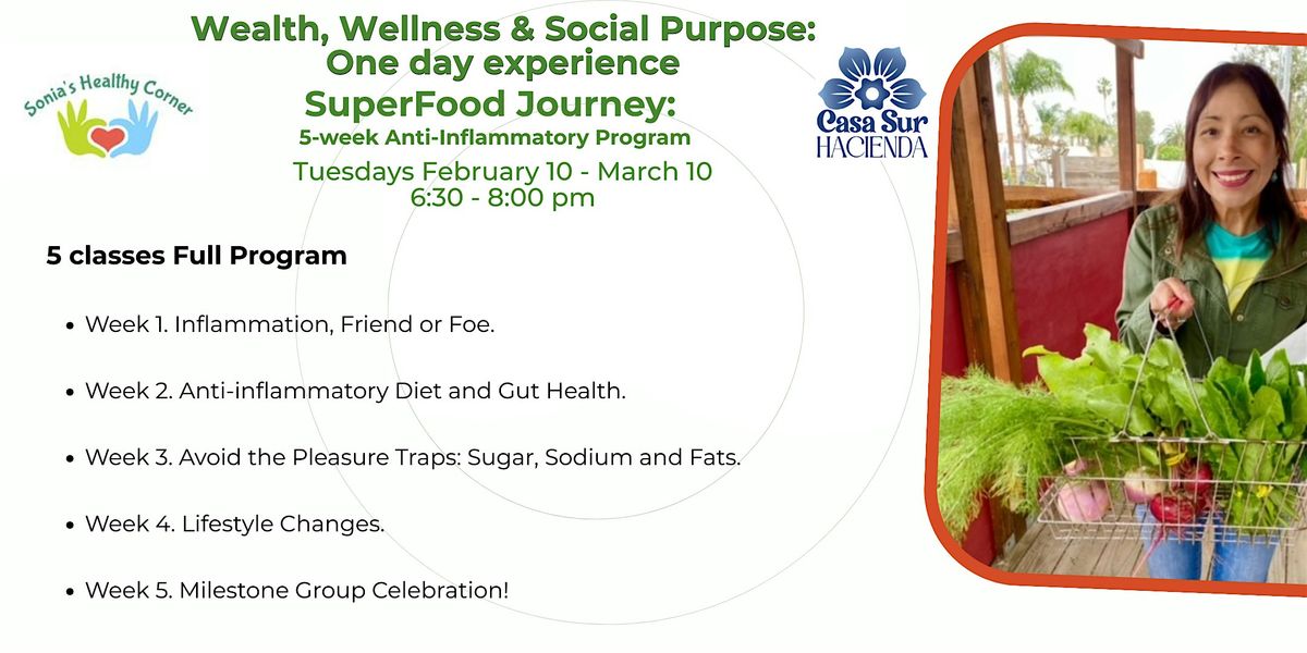 Join Nutritionist, Health Coach and Therapeutic Chef, Sonia Cervantes for a 5-week series designed to empower you to make 2026 your healthiest year! Combat inflammation, increase vitality, manage your weight, and fight disease one bite at a time, through evidence-based nutrition and lifestyle.