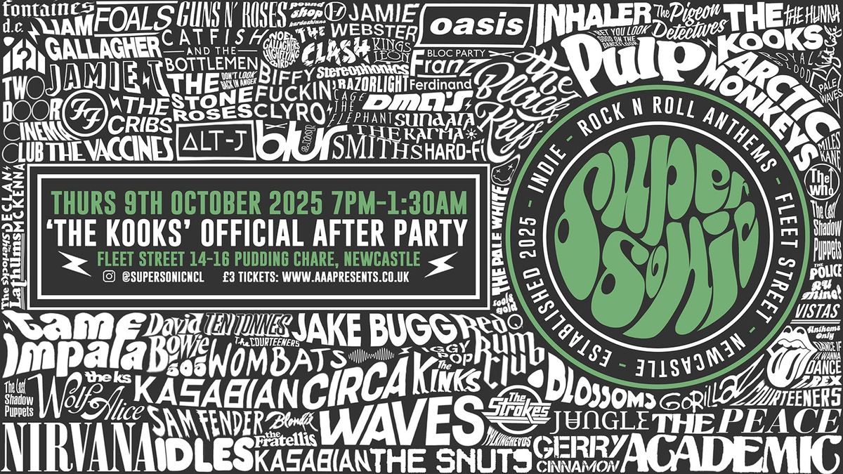 SUPSERSONIC "The Kooks Afterparty"π Fleet Street, Newcastleπ Thursday 9th OctoberΒ 2025π 7PM β 1:30AMπ Β£3 ENTRY (ticket required)π» Cheap drinks all night
