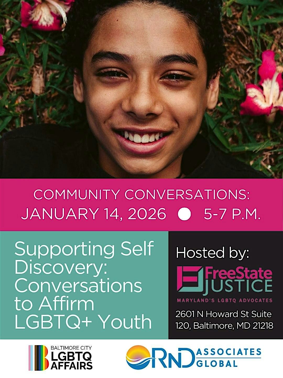 In this January Community Conversation, join us and RnD Associates at Freestate Justice as we hold conversations to affirm our LGBTQ+ Youth